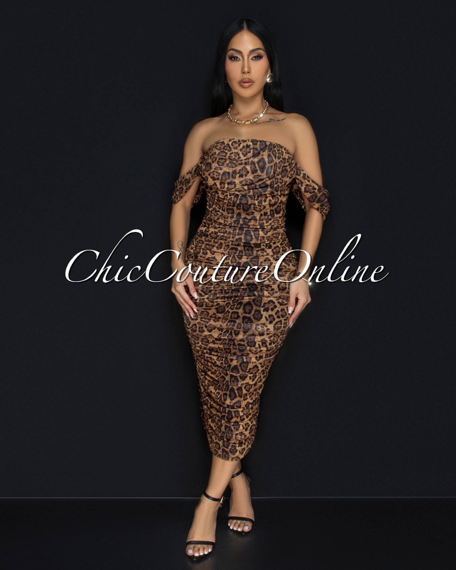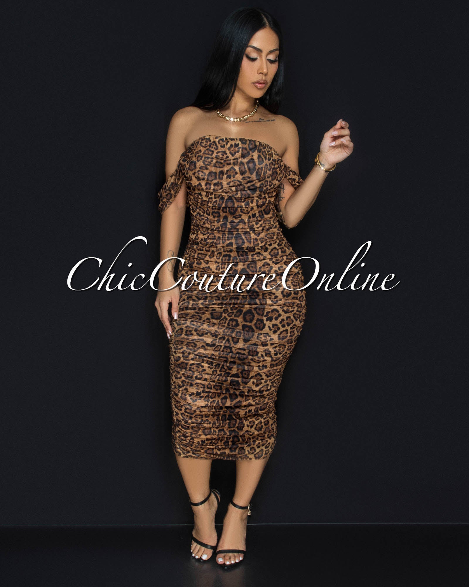 Altman Leopard Print Mesh Overlay Ruched Off-The Shoulder Dress
