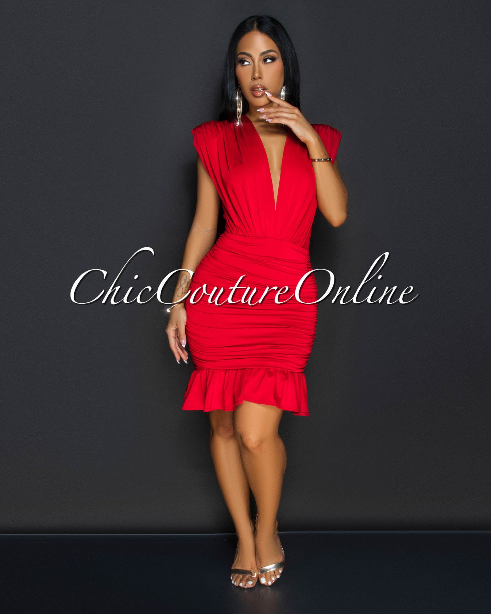 Amai Red Deep-V Ruched Ruffle Dress