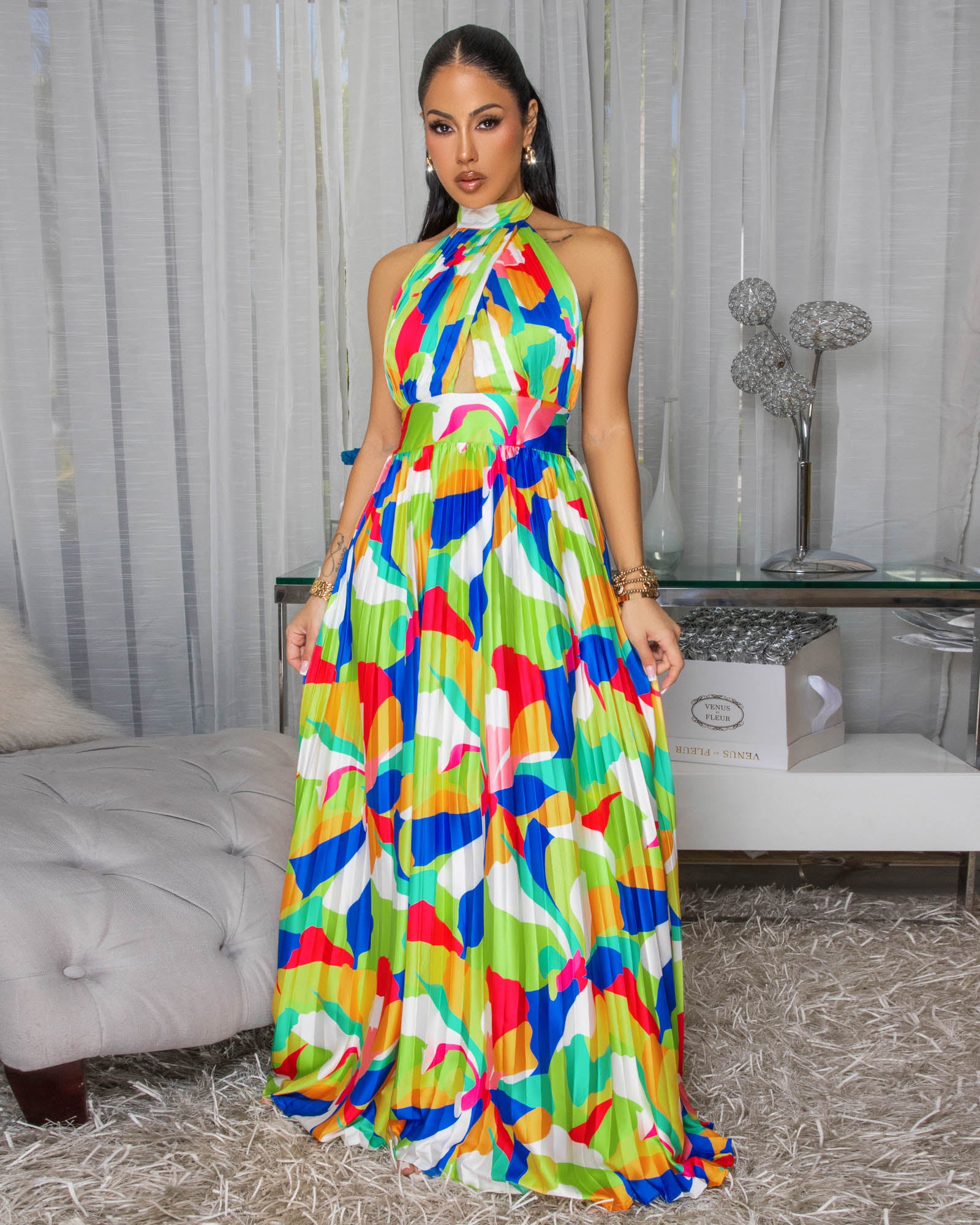 Delray Multi-Color Print Silky Halter Maxi Dress