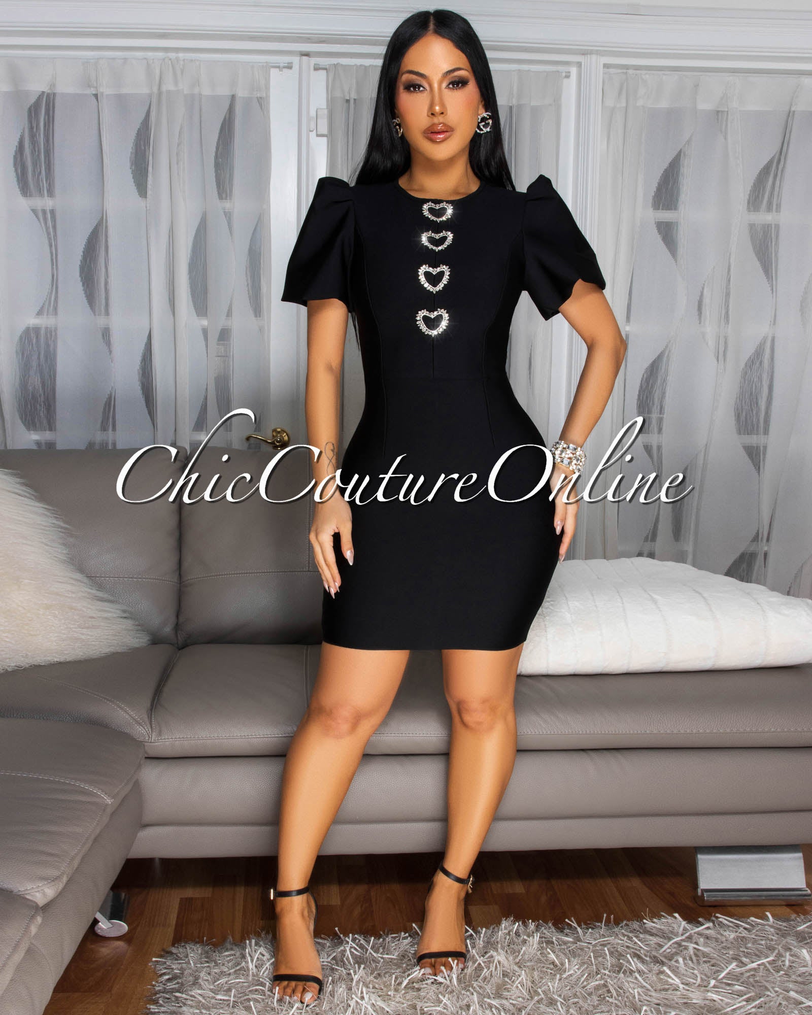 Contessa Black Puffy Sleeves Rhinestones Heart Bandage Dress