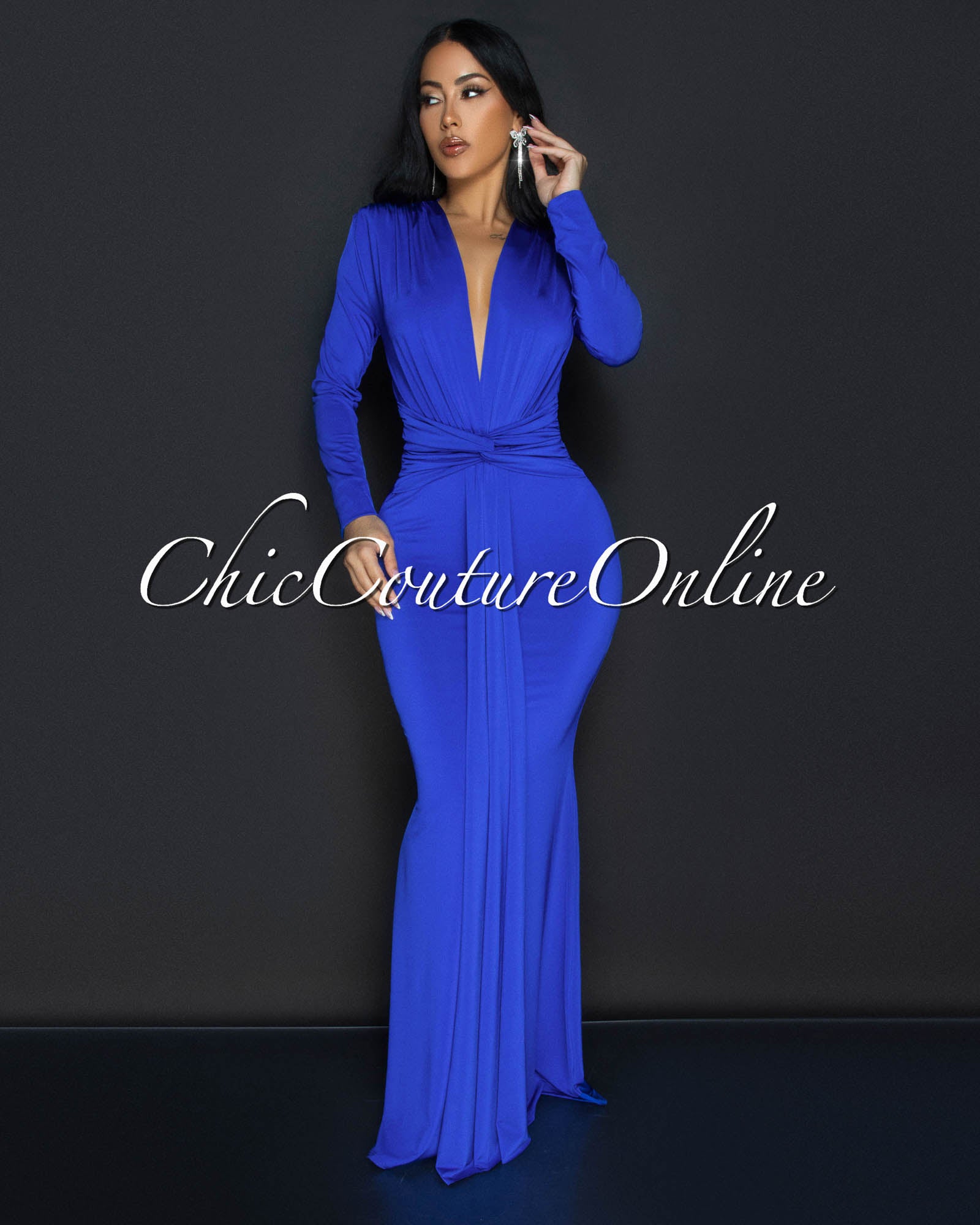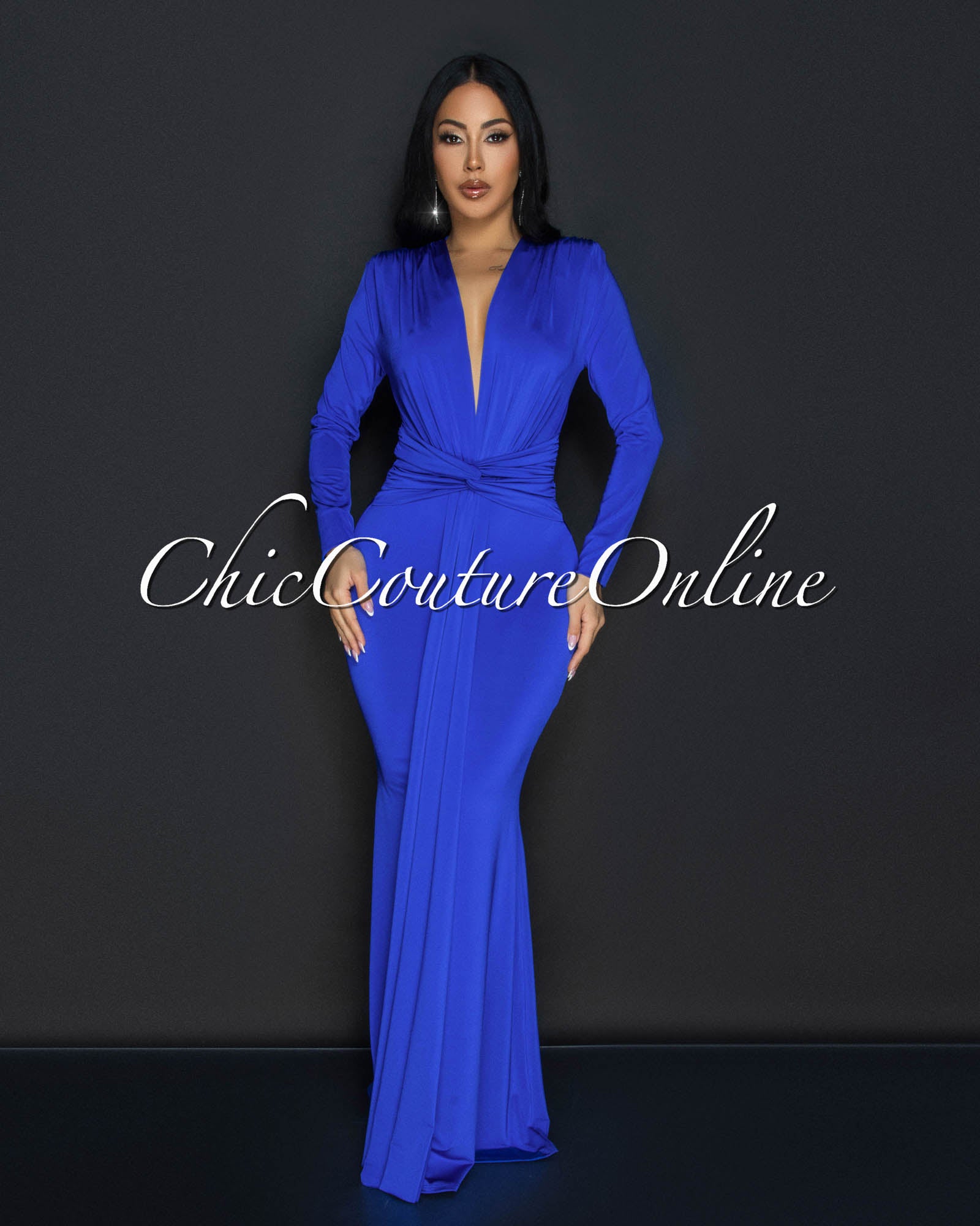 Cordelia Royal-Blue Long Sleeves Deep V-Neck Maxi Dress