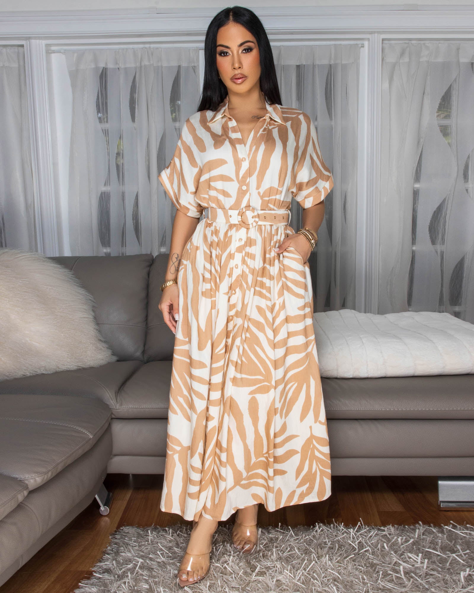 Dallas Nude Cream Print Belted Midi Dress