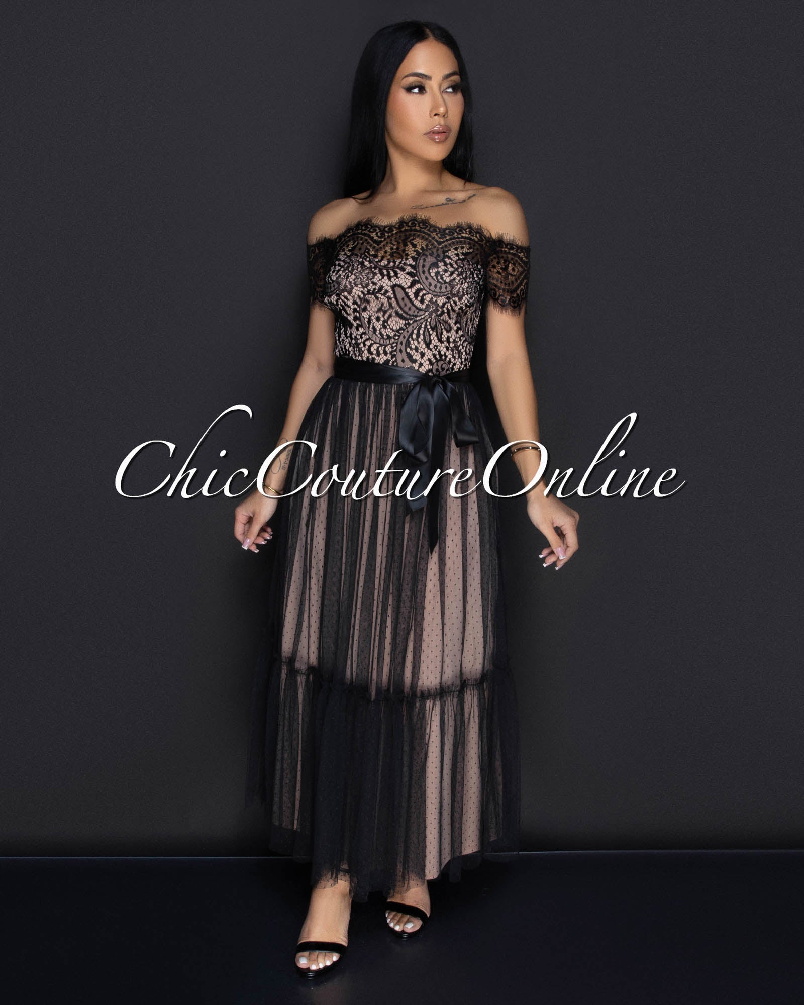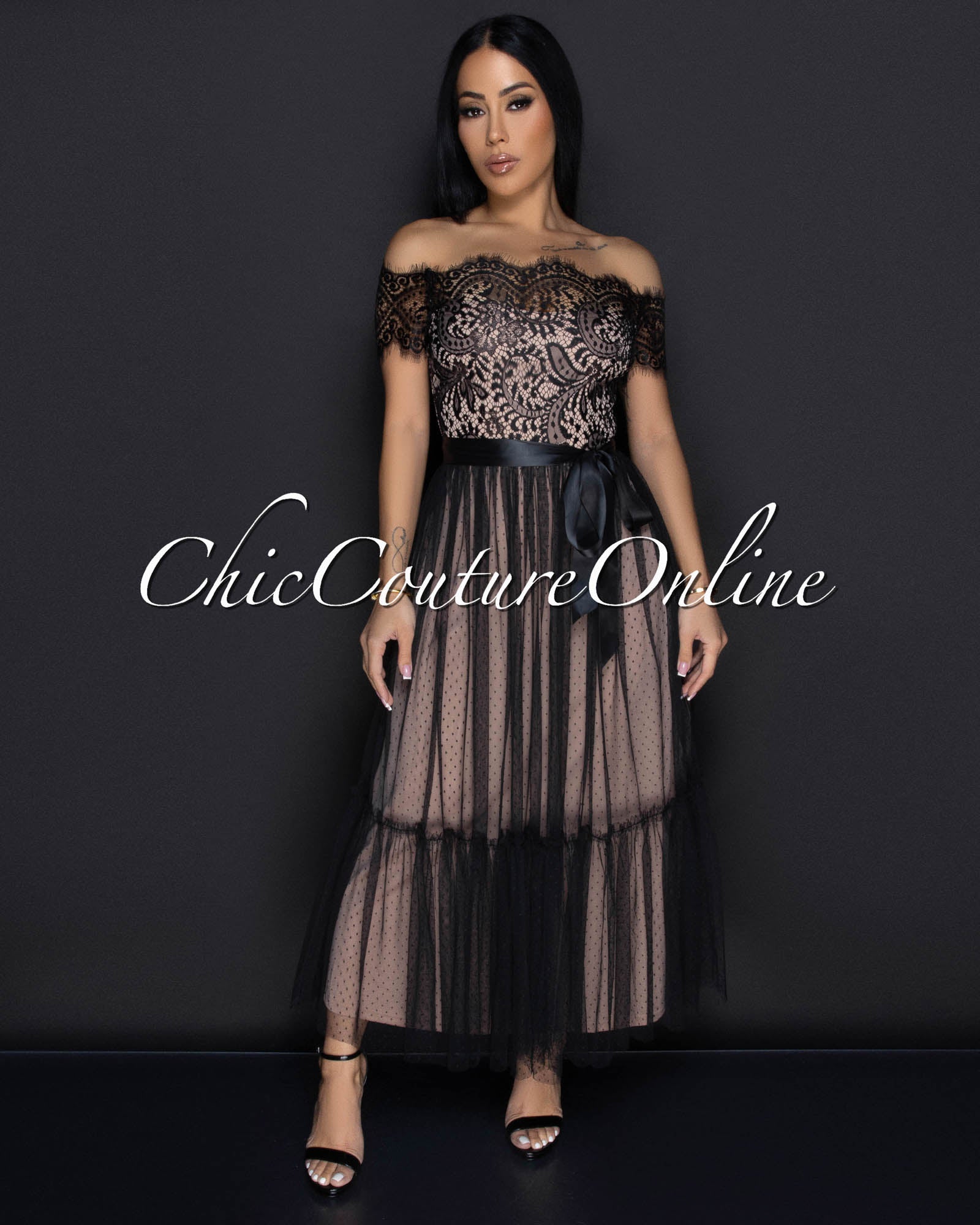 Cosetta Black Lace Nude Illusion Ribbon Midi Dress