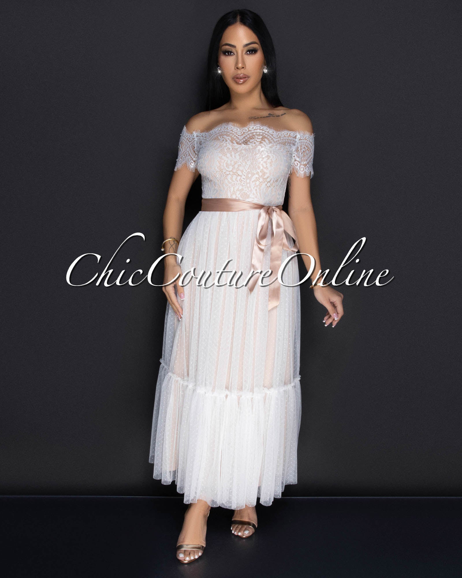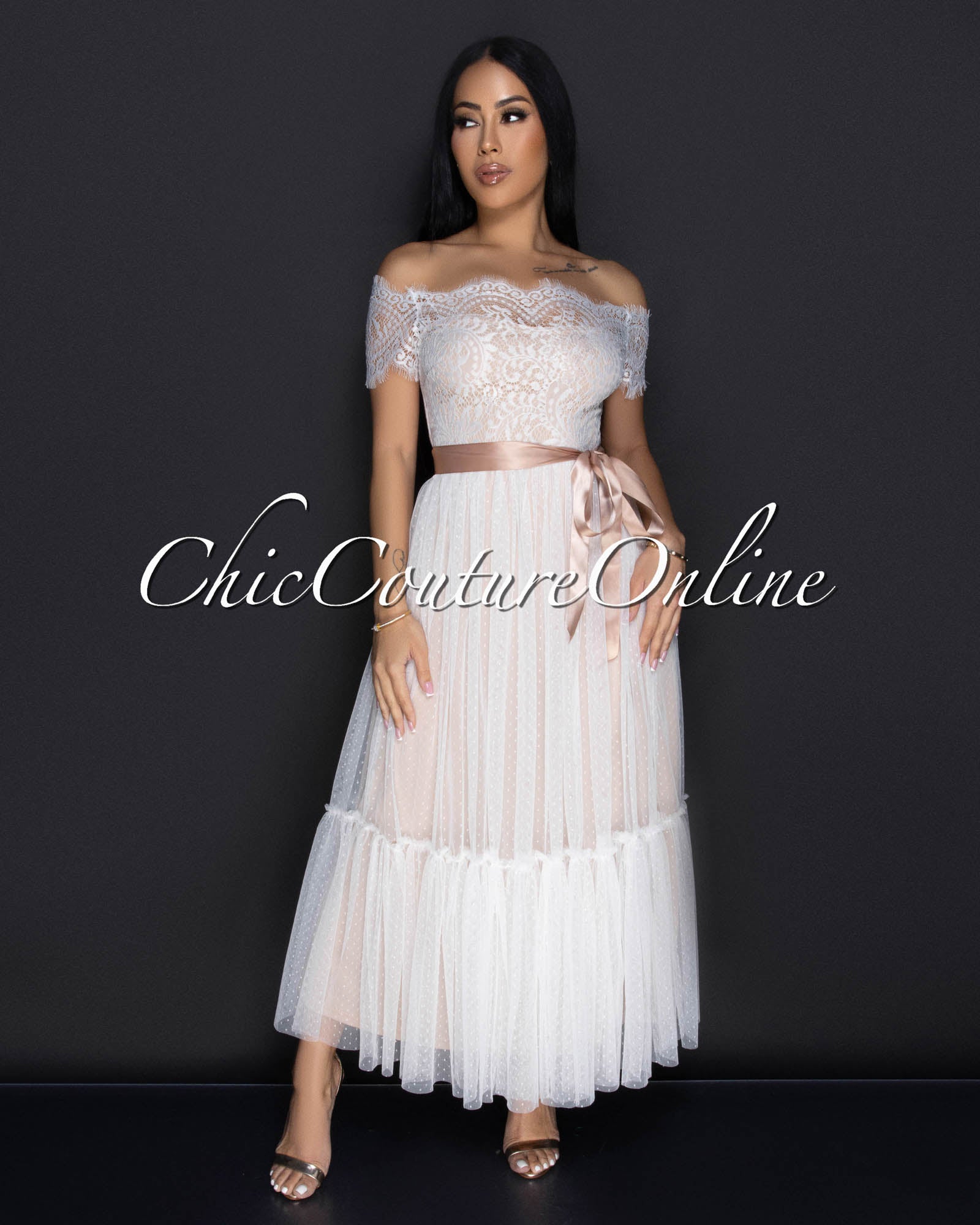 Cosetta White Lace Nude Illusion Ribbon Midi Dress