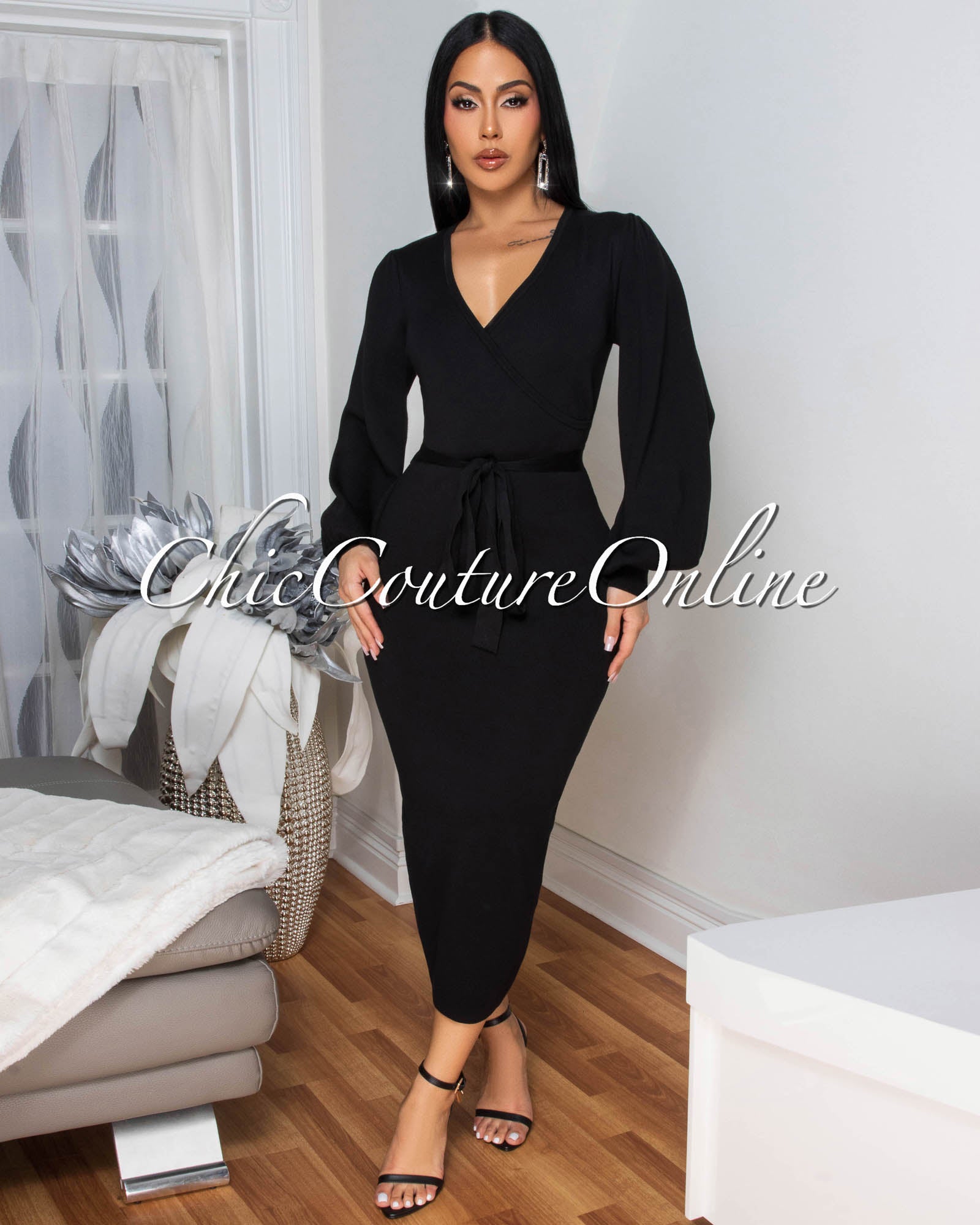 Cider Black Faux Wrap Knit Midi Dress