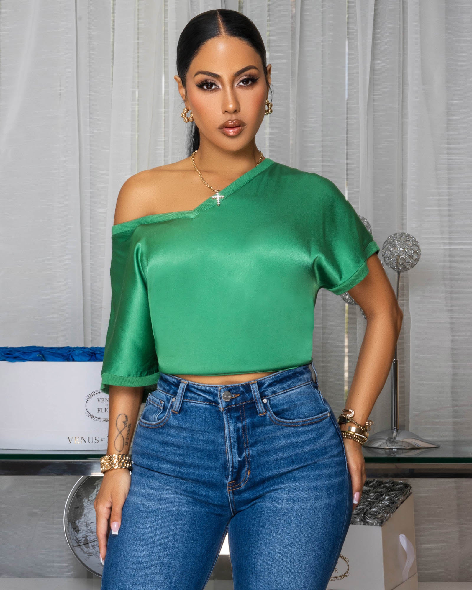 Sannela Forrest Green Silky V-Neckline Top
